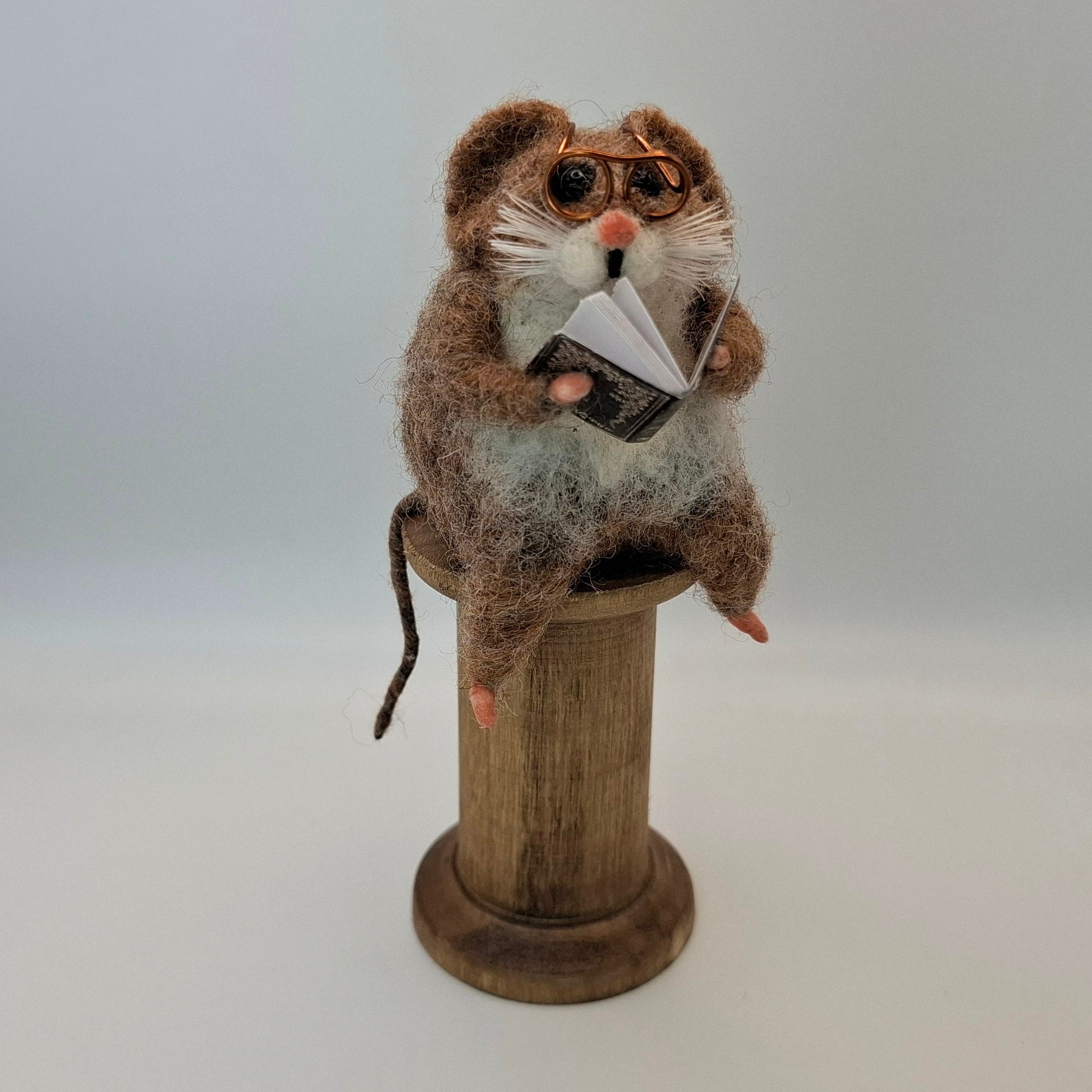 Must be a good read! Needle felted mouse sitting on a wooden bobbin with mini book and glasses. Freestanding. 12cm high and 5cm wide.
