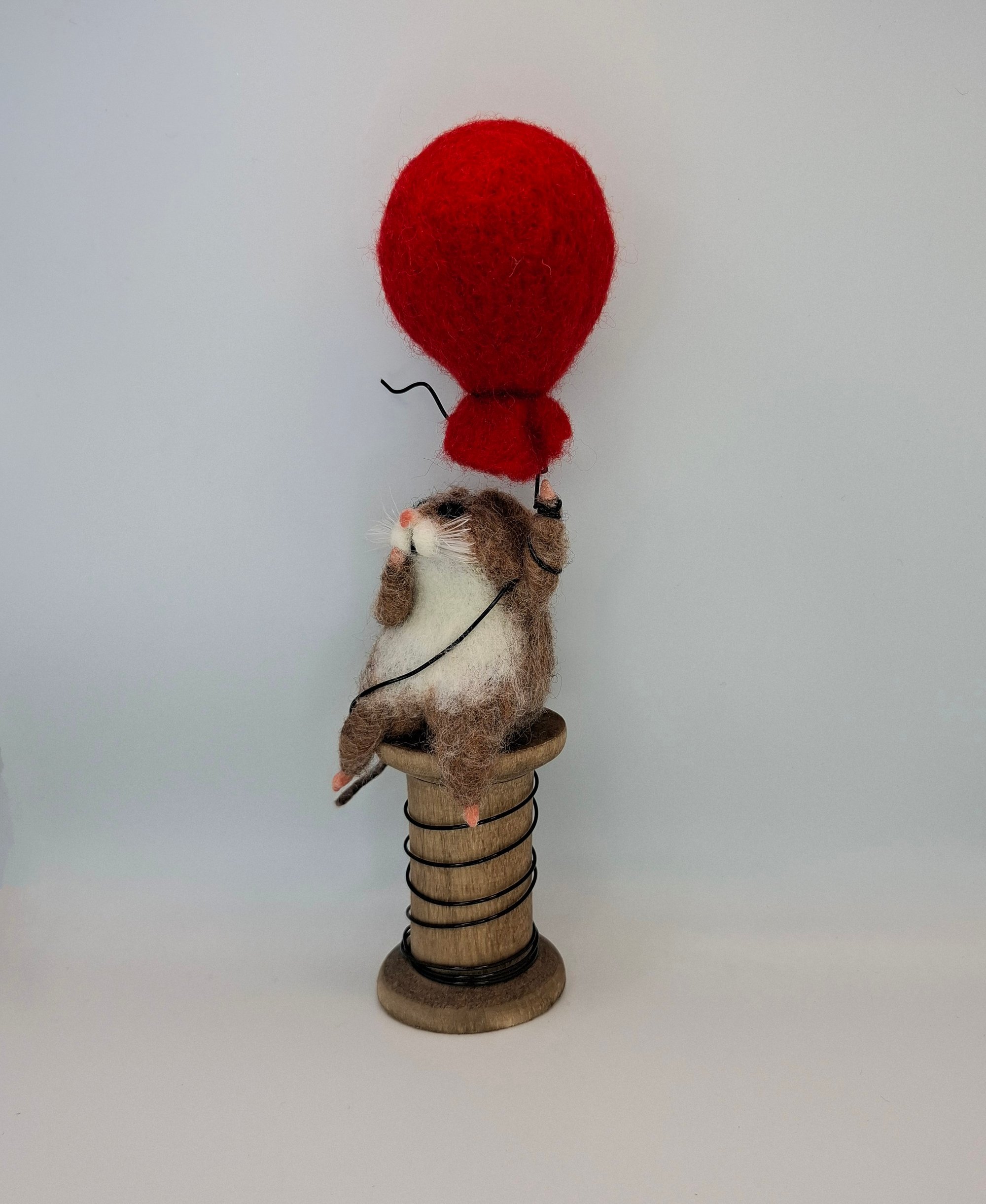 Where ever will he end up..? Needle felted mouse sitting atop a wooden bobbin with felt 'balloon'. Sits 19cm high on a 5 cm base. Freestanding.
